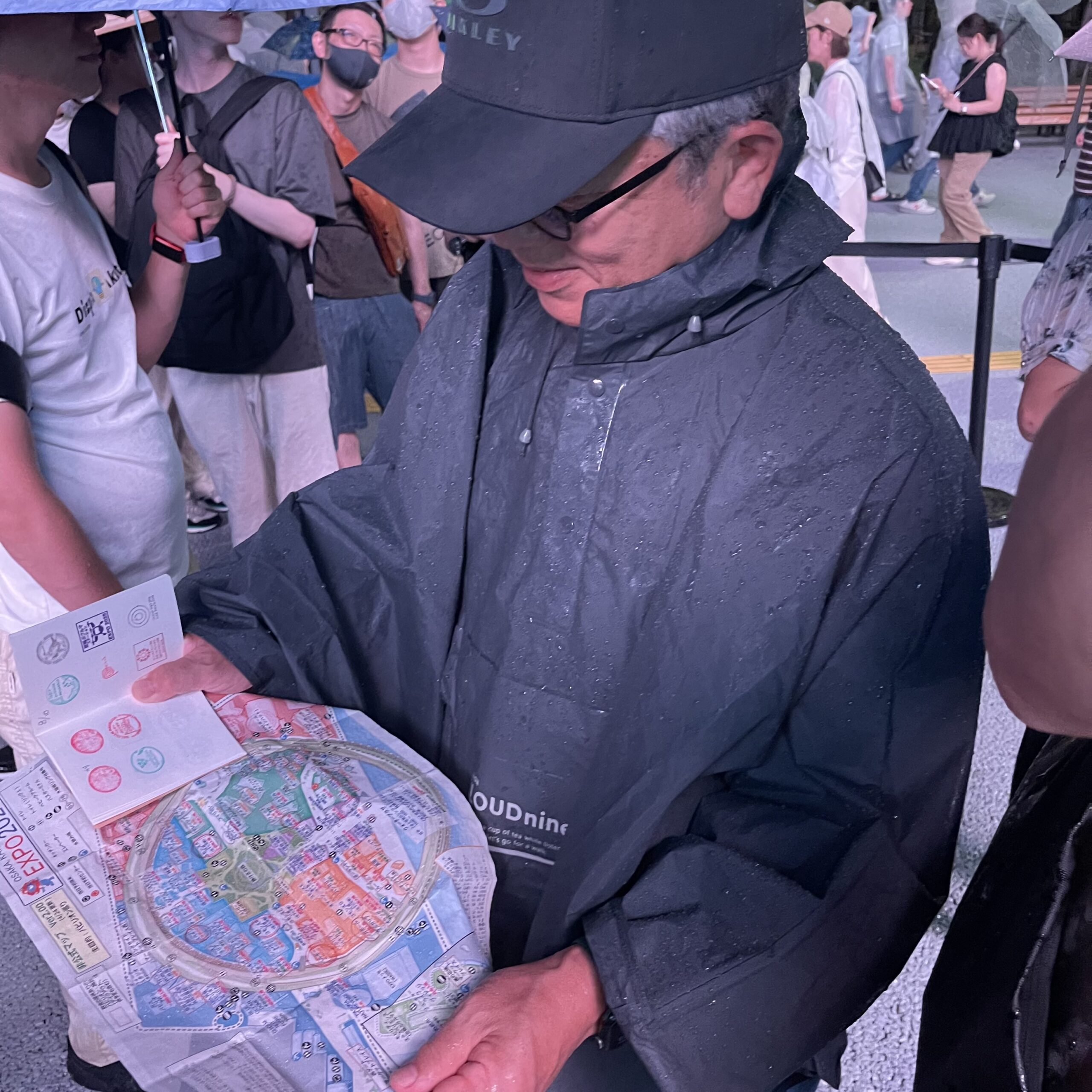 なぜTAGGED PAPERを選んだのか: 耐水性があり、雨に濡れても破れない 何度も折り畳んでもダメージを受けない 軽量でかさばらない 2. スタンプノートの作成 各パビリオンで押せるスタンプを集めるため、TAGGED PAPERでオリジナルのスタンプノートを作成。見開きで使いやすいよう工夫しました。 当日:雨風の中での実力発揮 地図の威力を実感 雨が降り始めた会場で、早速TAGGED PAPERの地図が活躍しました。